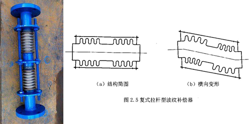 大拉桿波紋補償器的組成及工作原理:由中間接管連接的兩個波紋管及拉桿、端板等組成的的撓性裝置,以橫向位移方式補償平面或立體彎曲管段的熱位移,拉桿裝置應能承受壓力推力及其附加外力的作用。 復式拉桿型波紋補償器特別適合吸收橫向位移,此外,這種設計形式也可用于吸收軸向位移,角位移以及任意由這三種形式合成的位移,一般用法是將這種帶連桿的波紋補償器設置在呈90°的“Z”形管系的中間管臂內,調整連桿以阻止外部的軸向位移。