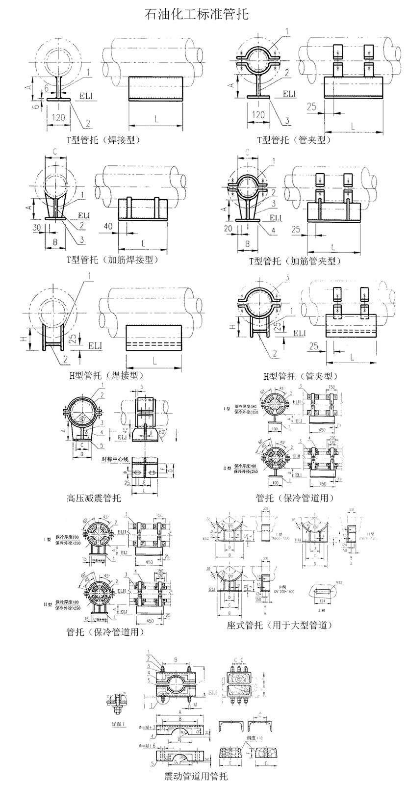 J1 T型管托(焊接型)、J2 T型管托(管夾型)、J3 T型管托(加筋焊接型)、J4 T型管托(加筋管夾型)、J5 H型管托(焊接型)、J6 H型管托(管夾型)、J7高壓減震管托、J8 T型管托(保冷管用)、J9 H型管托(保冷管用)、J10座式管托(用于大型管道)、J13 震動(dòng)管道用管托。