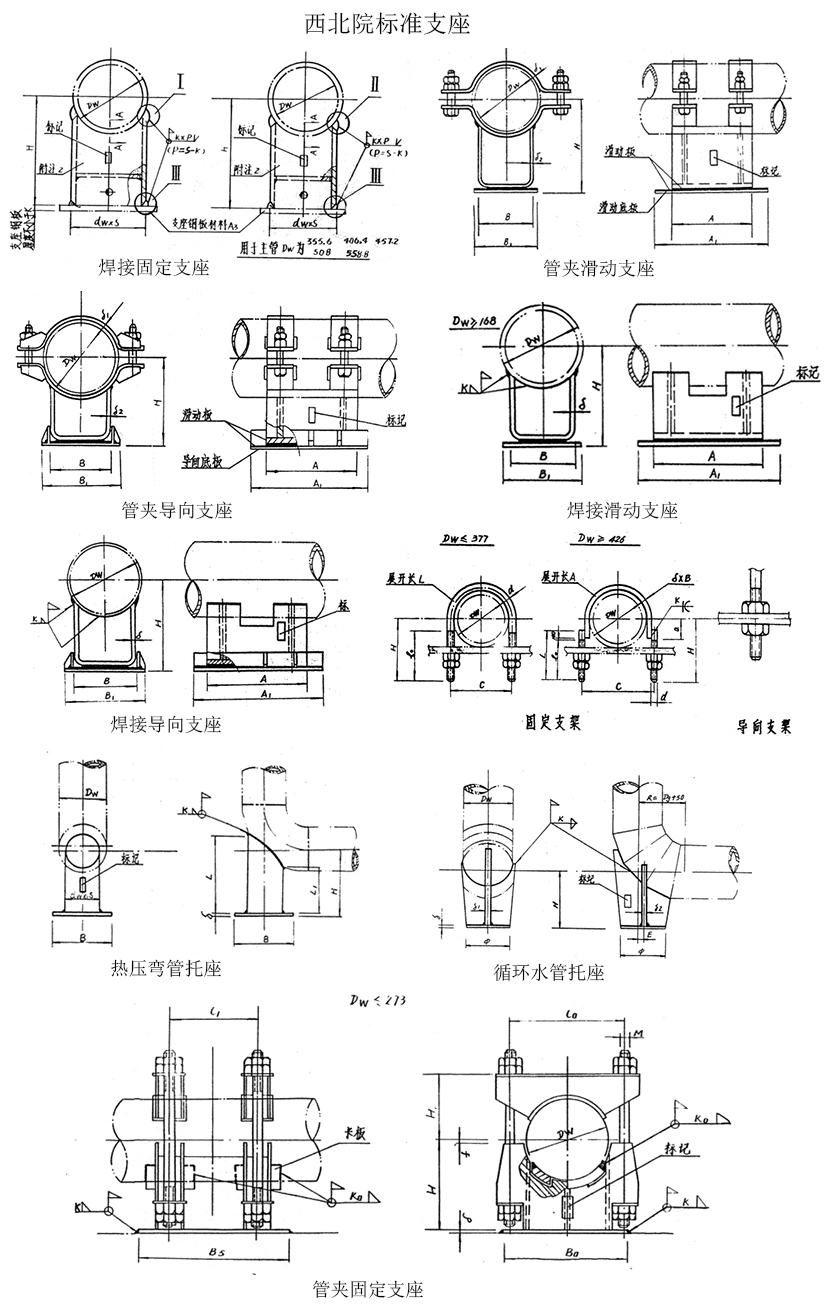 Z1 管夾固定支座、Z2/Z2A 焊接固定支座、Z3 管夾滑動支座、Z4 管夾導向支座、Z5 焊接滑動支座、Z6 焊接導向支座、Z7 管卡(無保溫)、Z11熱壓彎管托座、Z13 循環水管托座